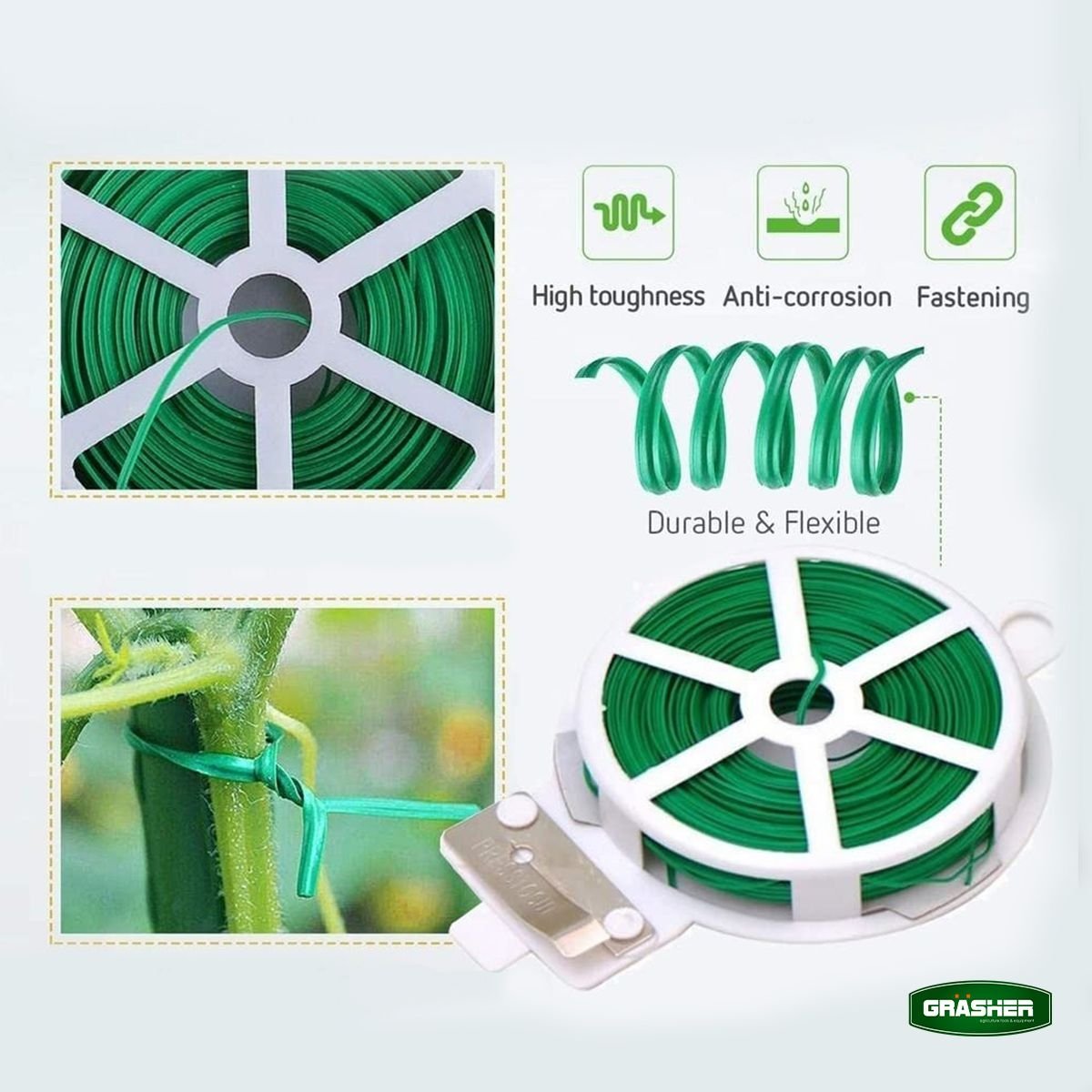 Το πλαστικοποιημένο σύρμα φυτών της Grasher σε ρολό 50 μέτρων αποτελεί την πιο πρακτική και οικονομική λύση για τη σταθερή υποστήριξη της καλλιέργειάς σας. Ο συνδυασμός του εσωτερικού μεταλλικού πυρήνα με την εξωτερική επένδυση PVC εξασφαλίζει τη μέγιστη σταθερότητα στη συγκράτηση, ενώ παράλληλα προστατεύει τους ευαίσθητους ιστούς των φυτών από ανεπιθύμητους τραυματισμούς.