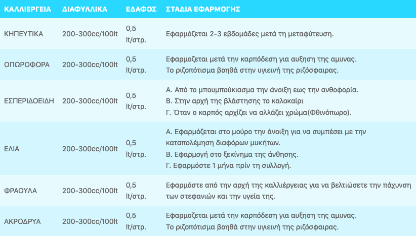 ● Ακρόδρυα: 200–300 cc/100 lt – μετά την καρπόδεση & για υγιή ριζόσφαιρα