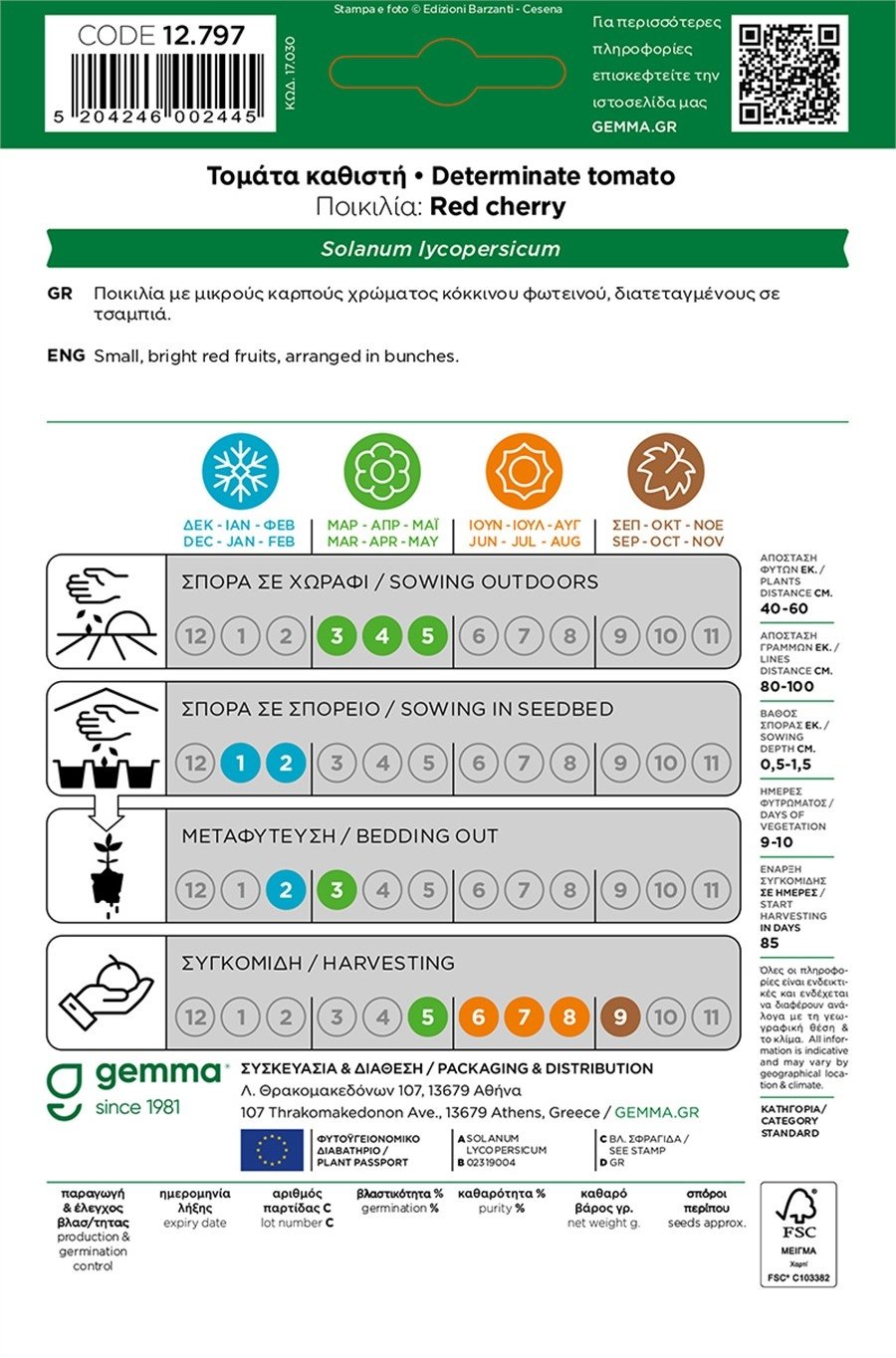 ● Συγκομιδή: Όταν τα τοματίνια κοκκινίσουν πλήρως. Δυνατή συγκομιδή «ολόκληρου τσαμπιού» για καλύτερη συντήρηση.