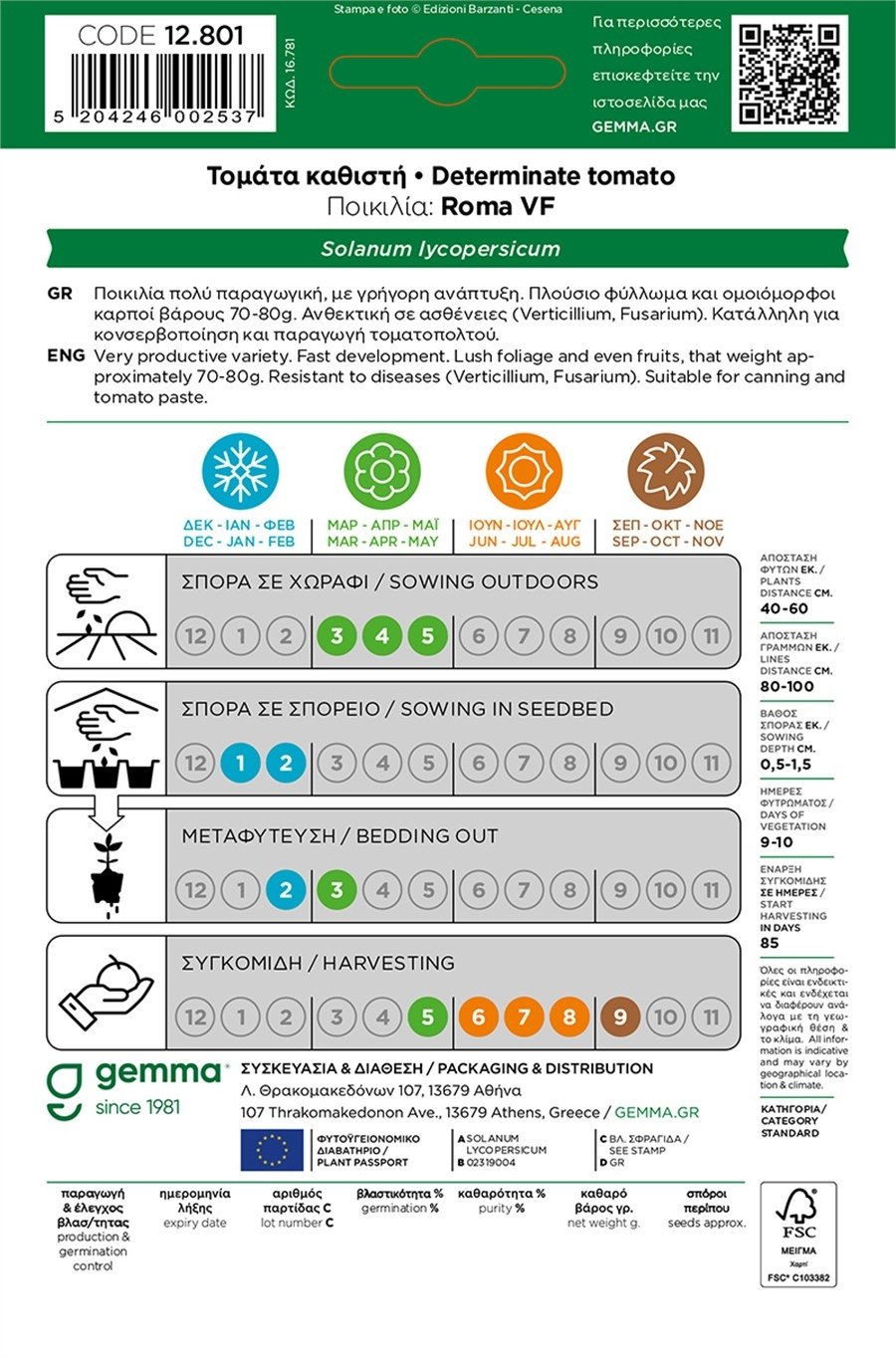 Η Τομάτα Roma VF Καθιστή της Gemma είναι η πιο δημοφιλής βιομηχανική ποικιλία για παραγωγή σάλτσας, πελτέ & κονσερβοποίησης. Με σαρκώδεις, αχλαδοειδείς καρπούς 70–80g, συνδυάζει πλούσια απόδοση, ομοιομορφία και εξαιρετική αντοχή σε ασθένειες (Verticillium & Fusarium).