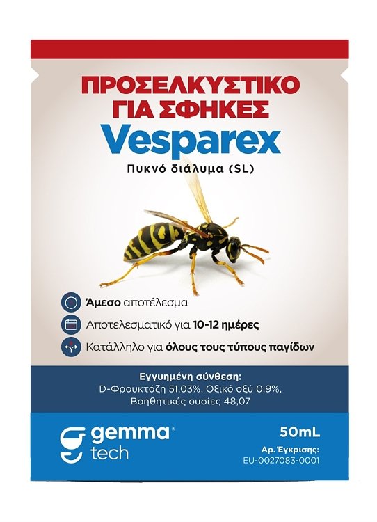 Το Vesparex 50ml είναι ένα ειδικό προσελκυστικό για σφήκες, ιδανικό για χρήση σε όλους τους τύπους παγίδων, τόσο σε εσωτερικούς όσο και σε εξωτερικούς χώρους. Η σύνθεσή του με συστατικά φυσικής προέλευσης εξασφαλίζει άμεσα αποτελέσματα και αποτελεσματική δράση έως και 10–12 ημέρες.