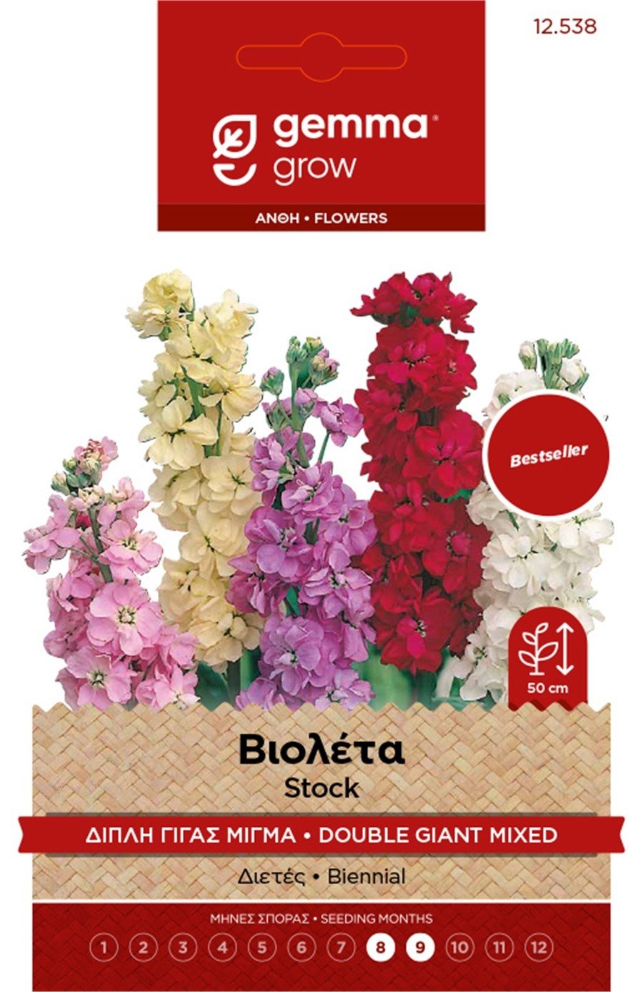 Η Βιολέτα Διπλή Γίγας Μίγμα Gemma είναι ένα bestseller διετές φυτό, που ξεχωρίζει για την πλούσια, πυκνή ανθοφορία του και το έντονο άρωμά του. Καλλιεργείται εύκολα σε ηλιόλουστα σημεία, προσφέροντας μεγάλα, διπλά άνθη σε αποχρώσεις που κυμαίνονται από απαλό ροζ έως βαθύ μοβ.