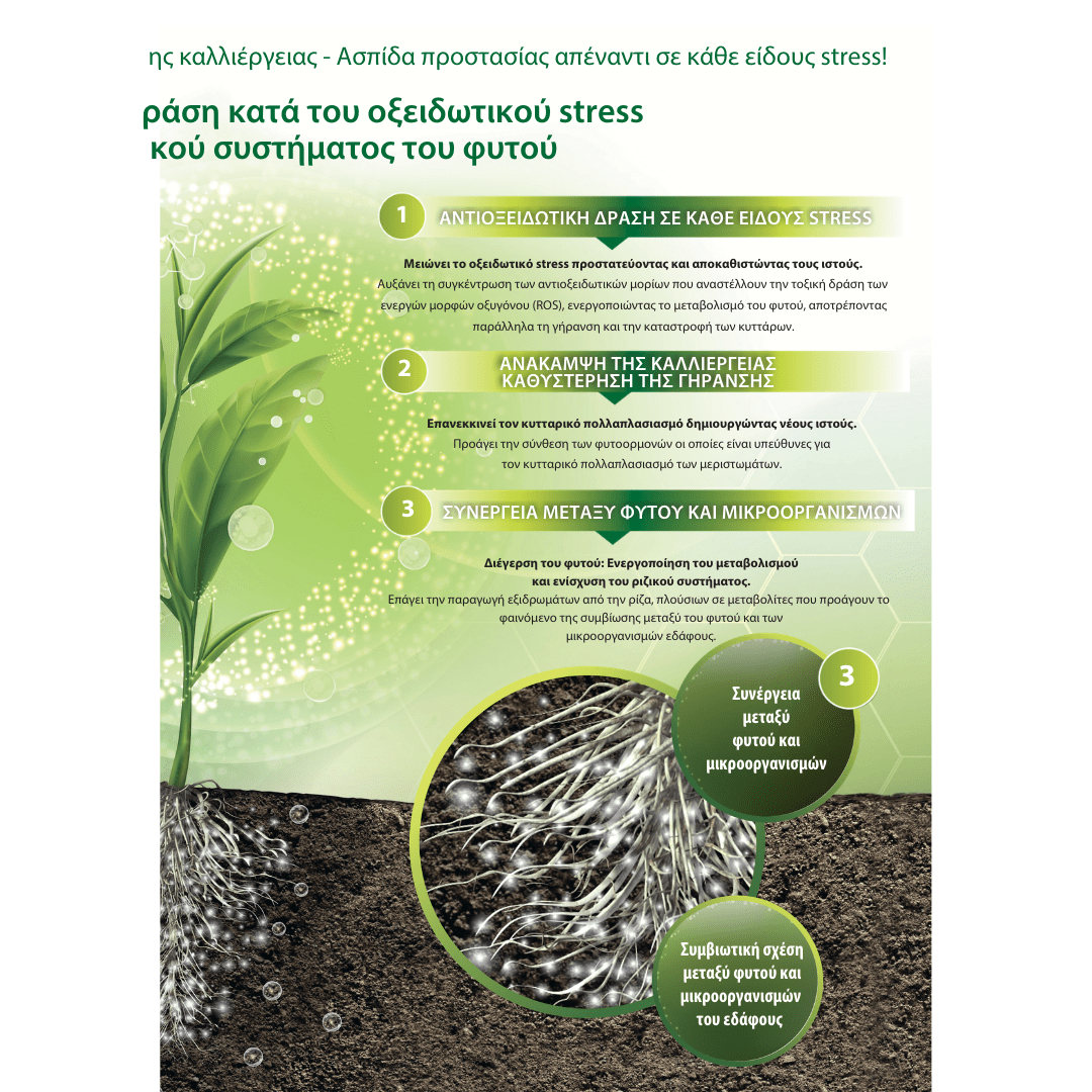 ✅ Ενίσχυση του ριζικού συστήματος και της συμβιωτικής δραστηριότητας με μικροοργανισμούς εδάφους.