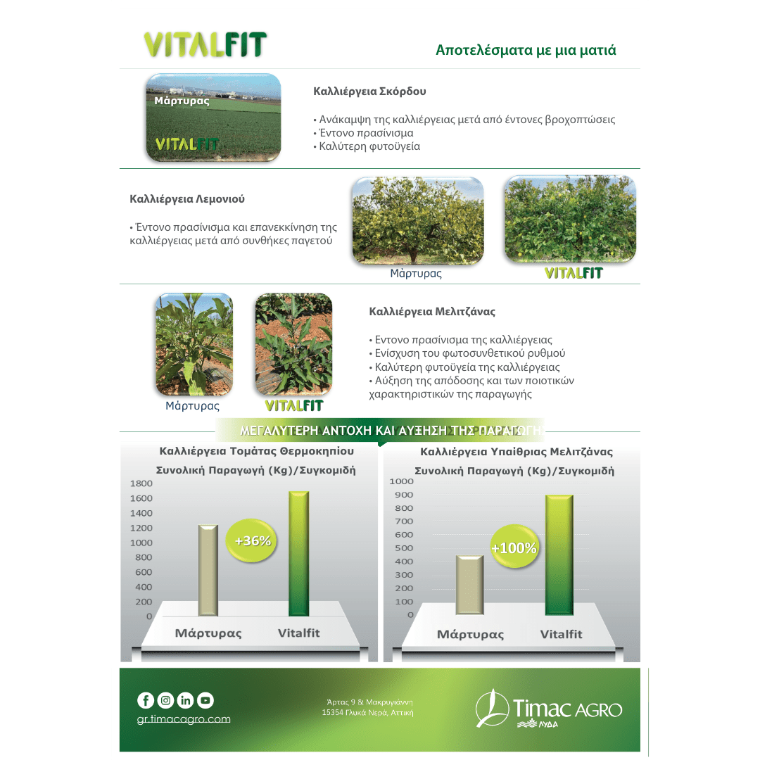 Η καινοτόμος σύνθεσή του ενεργοποιεί το μεταβολισμό του φυτού, επιβραδύνοντας την κυτταρική γήρανση και αποτρέποντας τον κυτταρικό θάνατο. Ενισχύοντας τη φυσική παραγωγή φυτοορμονών και αντιοξειδωτικών μορίων, το VITALFIT εξασφαλίζει την άμεση επανακκίνηση της καλλιέργειας και την απρόσκοπτη ανάπτυξή της, ακόμα και μετά από ακραία καταπόνηση.