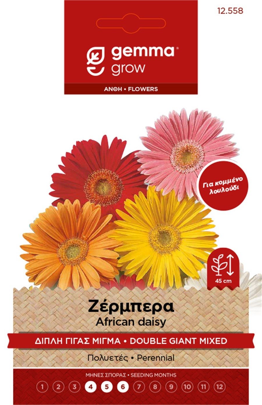 Η Ζέρμπερα Γίγας Διπλή Gemma είναι ένα πολυετές, εξαιρετικά διακοσμητικό φυτό με μεγάλα, ζωηρόχρωμα άνθη που αποτελούν κορυφαία επιλογή για κομμένα λουλούδια και ανθοδέσμες μεγάλης διάρκειας. Αναβλαστάνει και ανθίζει ξανά μετά την κοπή, προσφέροντας πολλαπλές ανθοφορίες μέσα στη σεζόν.