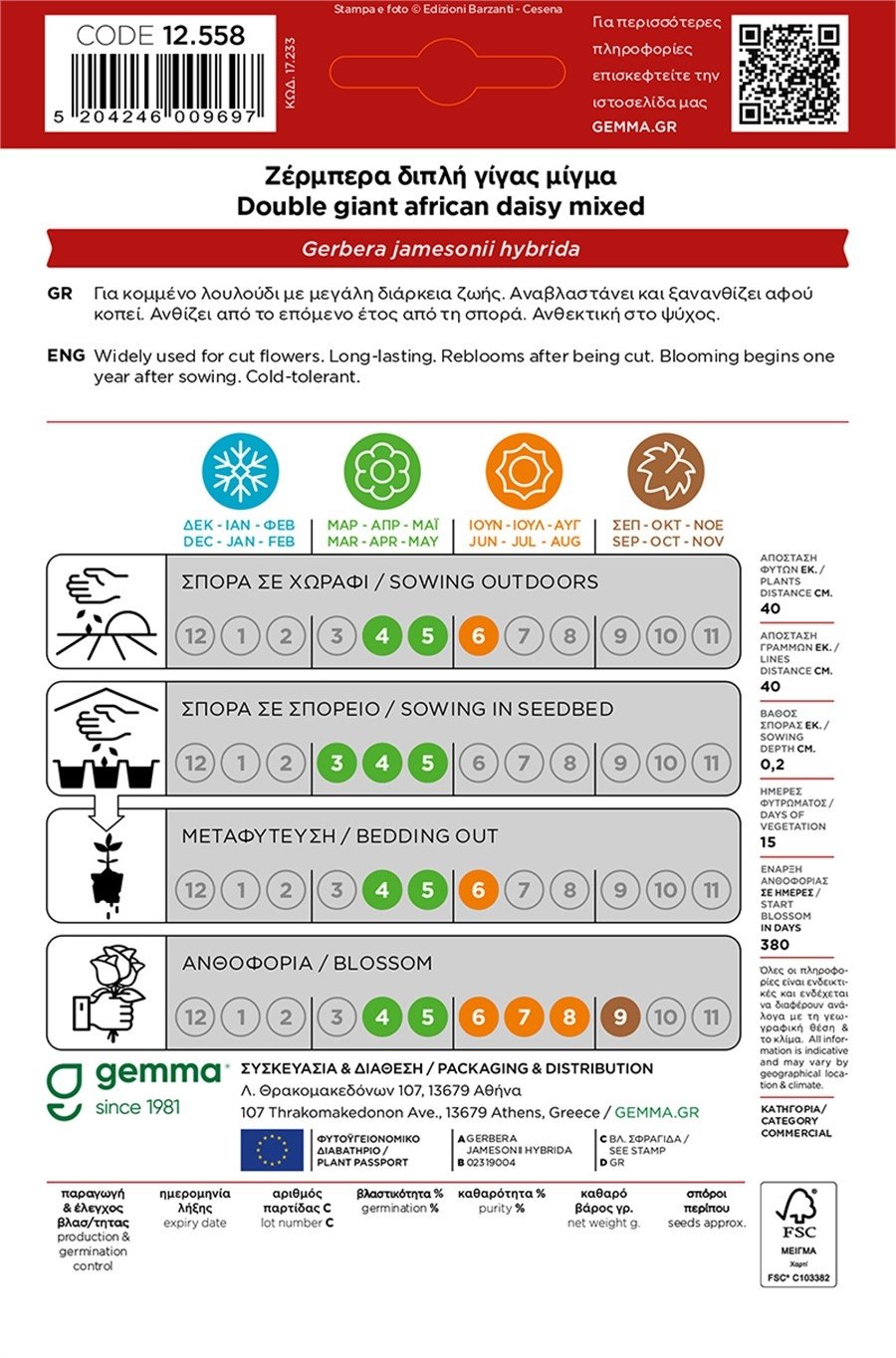 Ανθεκτική τόσο στον ήλιο όσο και στο ψύχος, η Ζέρμπερα Gemma καλλιεργείται εύκολα σε κήπους, θερμοκήπια ή γλάστρες. Ανθίζει από το επόμενο έτος της σποράς, με άνθη σε εντυπωσιακά χρώματα που φωτίζουν κάθε χώρο. Ιδανική επιλογή για επαγγελματίες ανθοπαραγωγούς αλλά και λάτρεις του καλλωπιστικού κήπου.